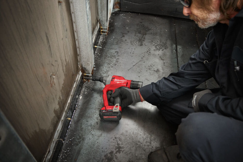 - Instaluje łączniki HUCK® 4,8 mm i 6,4 mm, w tym Bobtail® Magna-Grip®, C6L®, C120L® i Hucktainer®. Wszystkie zespoły nosowe i adaptery HUCK® są sprzedawane osobno. Podczas montażu Hucktainers® wymagana jest dodatkowa obudowa zewnętrzna od MILWAUKEE®. HUCK® jest znakiem towarowym Huck International Inc. i Howmet Aerospace Inc